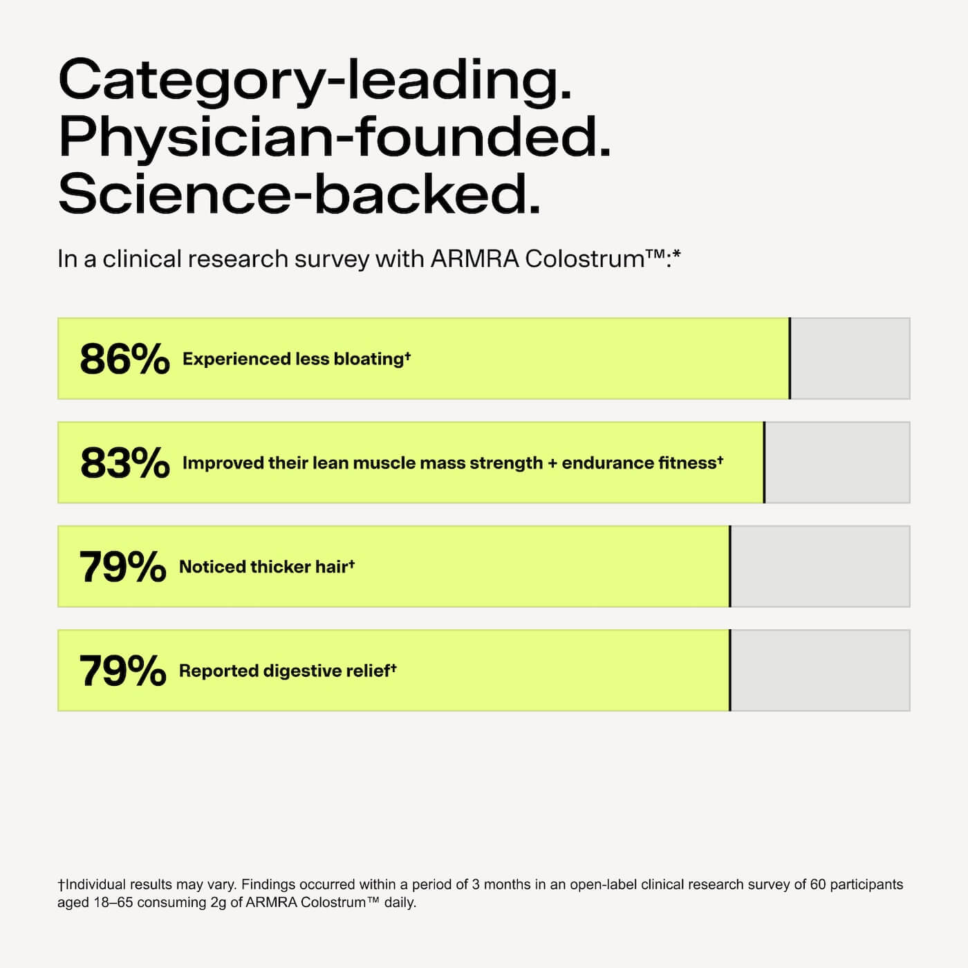 ARMRA Colostrum™ delivers proven immune and gut support: it boosts innate immune cell responsiveness by over 32% vs standard colostrum, activates rapid immune defense within 2 hours, and increases metabolic activity in stressed gut and immune cells. Backed by science and 20,000+ 5-star reviews.